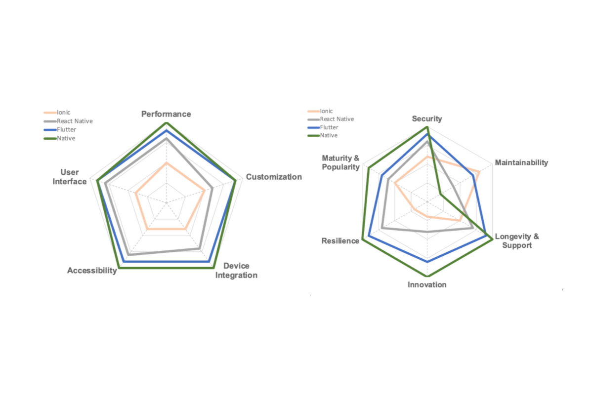 Omnicanalità: React Native e soprattutto Flutter, con la sua nuova compilazione HTML + JS, sono ideali per lo sviluppo multi-piattaforma. Ionic offre flessibilità grazie al suo approccio basato sul web, mentre lo sviluppo nativo è limitato in questo ambito.